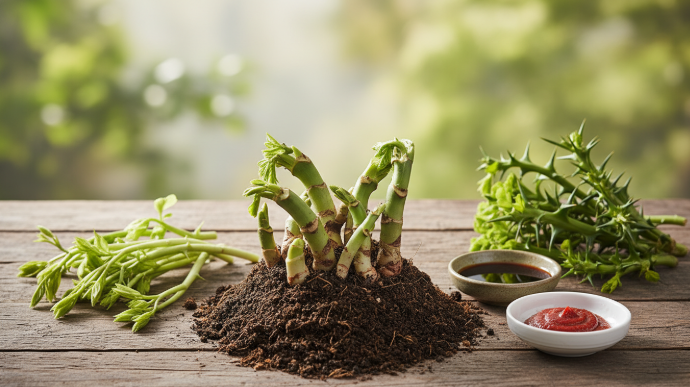 - ① 땅두릅 (독활): 이름처럼 땅에서 솟아나는 땅두릅은 줄기가 굵고 가시가 거의 없는 것이 특징입니다. 아삭한 식감이 뛰어나며 땅두릅만의 쌉싸름한 맛은 미식가들이 특히 선호합니다.